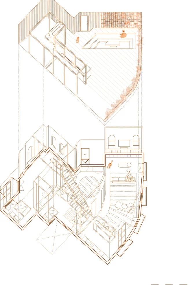 Ubicado en lo alto de un edificio esquinero en chaflán del Eixample barcelonés, Éventail renueva un ático de 170 m² y una terraza en la azotea como reinterpretación contemporánea del apartamento catalán. Conserva vestigios clave -vigas de madera, baldosas hidráulicas, diseños ornamentales- al tiempo que introduce una arquitectura luminosa que se despliega como un abanico(éventail, en francés), pivotando desde una escalera central hasta un espacio radial en la fachada frontal.