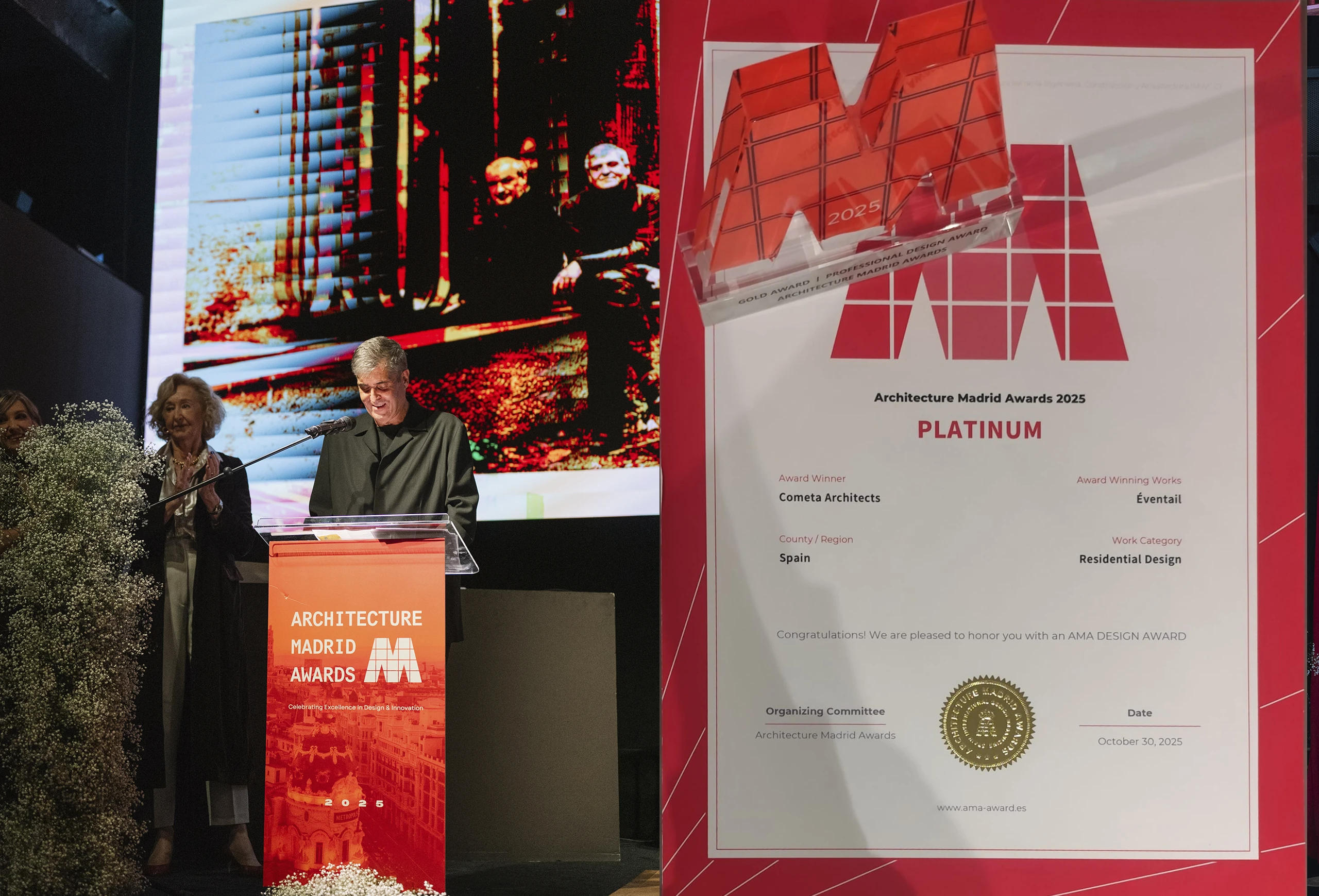 The jury praised Éventail for its contemporary sensitivity, craftsmanship, and architectural innovation within the historic fabric of Barcelona’s Eixample. During the ceremony, Cometa Architects presented their work alongside leading studios, including Pritzker Prize laureates RCR Arquitectes, also celebrated at the event.