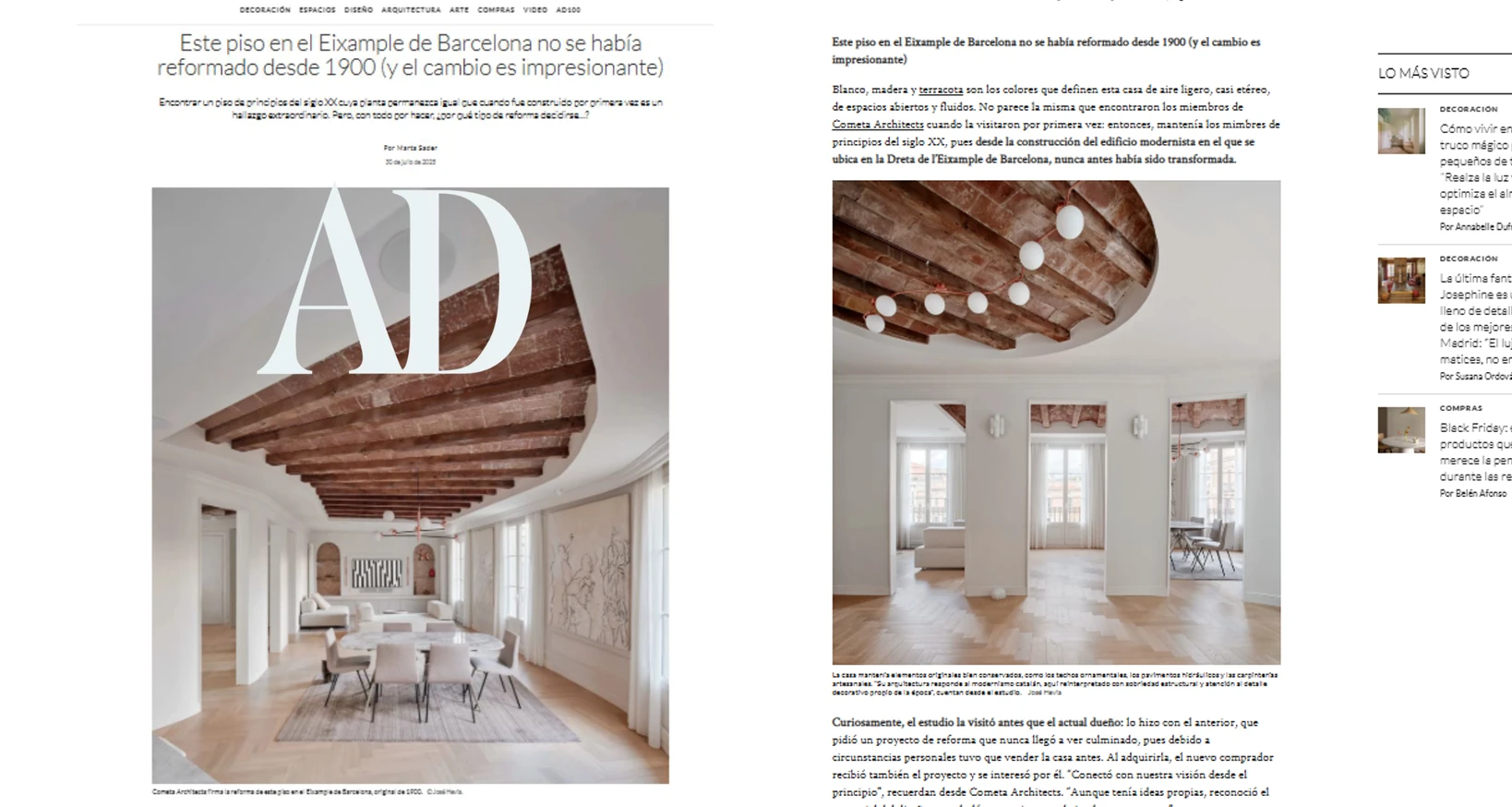 Architectural Digest España has featured Cometa Architects’ latest Eixample renovation, a milestone that reinforces the studio’s presence within the international design scene. Being published by AD — one of the most influential architecture and interior design platforms — brings significant visibility, connecting the project with a global audience of professionals, editors, clients, and design-minded readers.