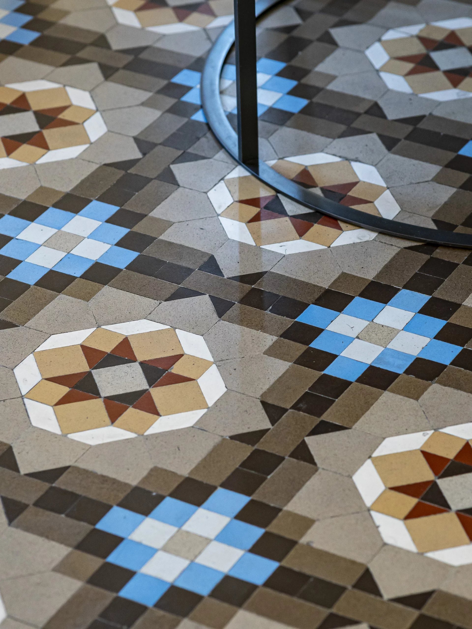 The living and dining hall, the home’s social heart, restores the original Noia mosaic floors and conceals lighting, audio, and climate systems behind a serene material palette.