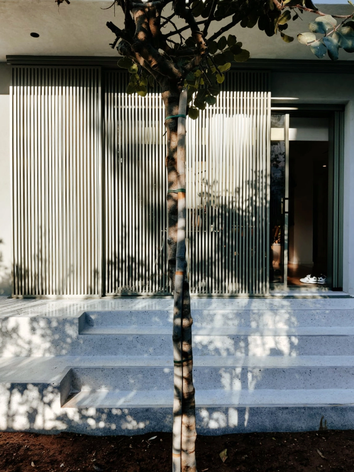 The garden, spread across three levels, preserves existing fruit trees and introduces new Mediterranean vegetation, enhancing comfort and shade during Athens’s hot summers.